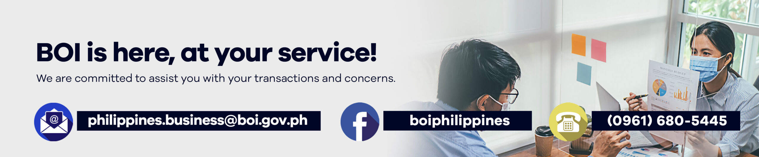 As an attached agency of Department of Trade and Industry (DTI), The Philippine Board of Investments (BOI) is responsible for the development of investments here in the Philippines. Leading the promotions of various industries and investment opportunities, BOI assists Filipino and foreign investors to venture and thrive in vast areas of economic pursuits and acts as your one-stop shop in doing business in the Philippines.