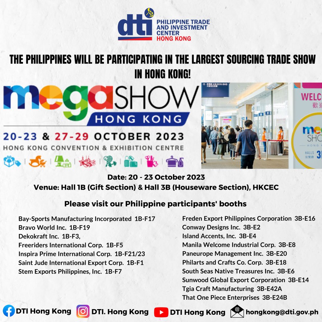 Hong Kong – The Philippine Trade and Investment Center – Hong Kong (PTIC-HK) invites overseas Filipinos and buyers from Hong Kong and Mainland China to support the 17 participating Filipino companies in the Mega Show 2023 on 20 to 23 October 2023 at the Hong Kong Convention and Exhibition Centre.
