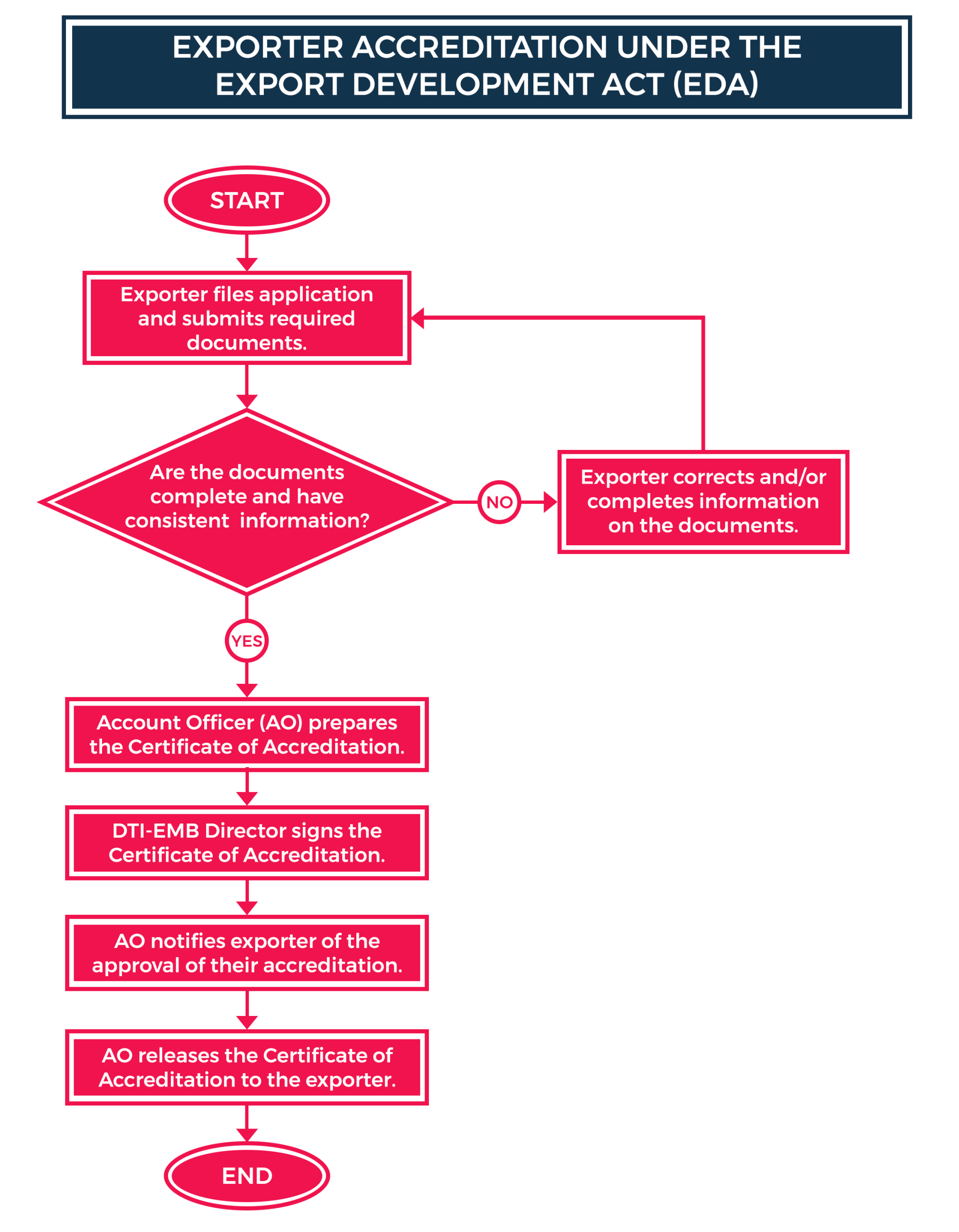 The EDA Accreditation of EMB is used to facilitate the VAT Credit/ Refund claims of Exporters with the Bureau of Internal Revenue, in enjoying zero-rated sales from their supplier of raw materials or packaging materials. This is one of the incentives provided under the Export Development Act. Accredited companies are issued a Certificate of Accreditation valid for one (1) year.
