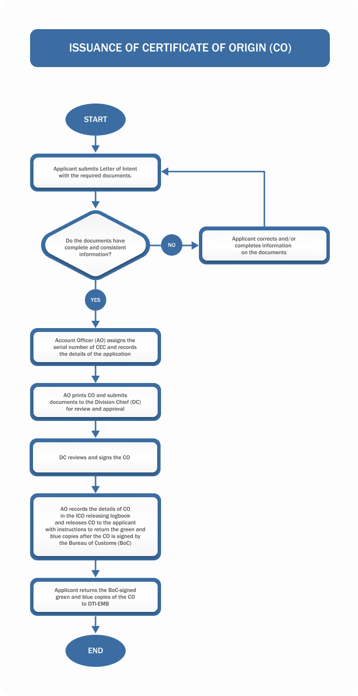 Required Documents 1. Photocopy of Validated Export Declaration (ED) stamped with Authority to Load and Date; 2. Photocopy of Commercial Invoice; 3. Photocopy of Packing Lists; and 4. Photocopy of Signed Bill of Lading (BL) or Airway Bill (with Date of Loading) Download full flowchart HERE. Important Notice To maintain health protocol and safety during the pandemic, the applicants are requested to submit the scanned copy of the required documents through the email addresses at [email protected] and [email protected]. The same process is still followed except that the approval of the Certificate of Origin is every Wednesday only during when the skeleton workforce is present. Releasing will be coordinated with the Guard on Duty for the convenience of the client applicant. |
