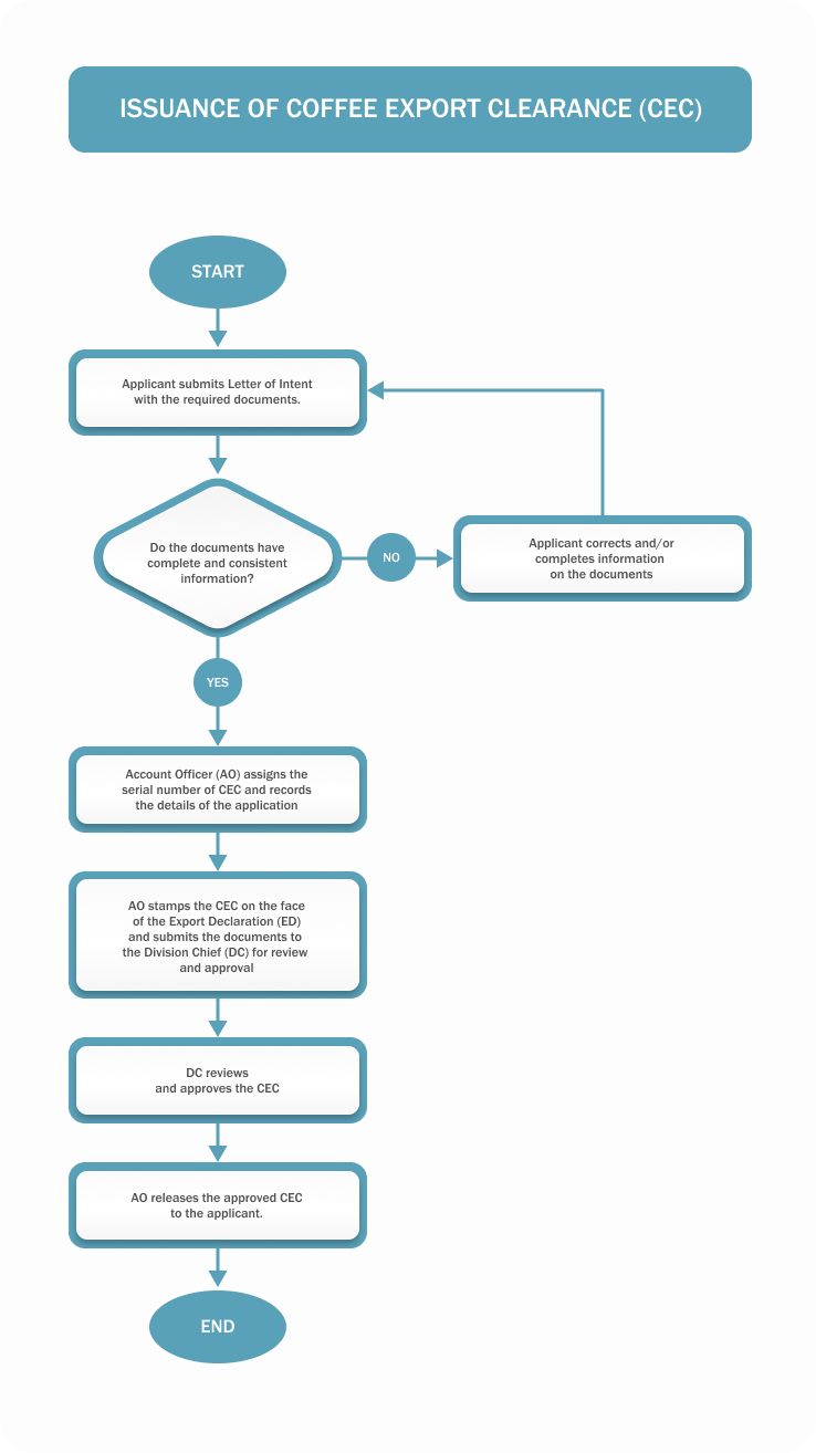 Download full flowchart HERE. Important Notice To maintain health protocol and safety during the pandemic, the applicants are requested to submit the scanned copy of the required documents through the email addresses at [email protected] and [email protected]. The same process is still followed except that the approval and releasing of the Coffee Export Clearance (CEC) is now online. |