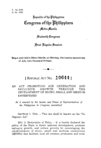 This is the full text of Republic Act No. 10644: “An Act Promoting Job Generation and Inclusive Growth Through the Development of Micro, Small and Medium Enterprises”, otherwise known as the “Go Negosyo Act”. It was enacted into law on 15 July 2014 by His Excellency President Benigno Simeon C. Aquino III.