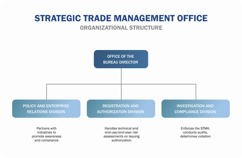 The objective of the STMO is to create an environment in which the Philippines can promote investments in high-value goods and technologies, as well as generate jobs for highly skilled professionals. The STMO has three divisions composed of individuals who possess legal, technical and non-technical expertise in non-proliferation.