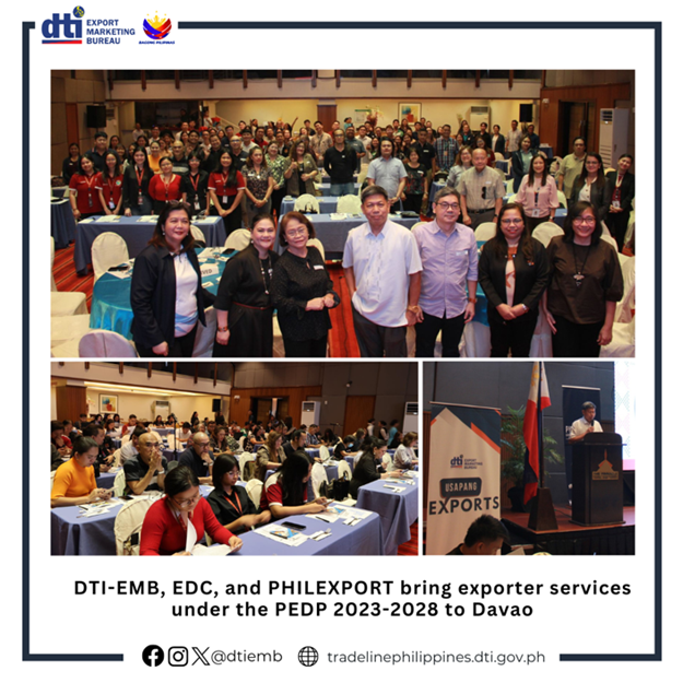 Davao City, Philippines—The Export Development Council (EDC)—through the Department of Trade and Industry’s Export Marketing Bureau (DTI-EMB) and the Philippine Exporters Confederation, Inc. (PHILEXPORT)—launched the rollout of the Philippine Export Development Plan (PEDP) in Cebu and Davao through “Usapang Exports” information sessions. In collaboration with the DTI-Regional Operations Group, this initiative is part of the nationwide effort to engage and empower exporters across the Philippines.