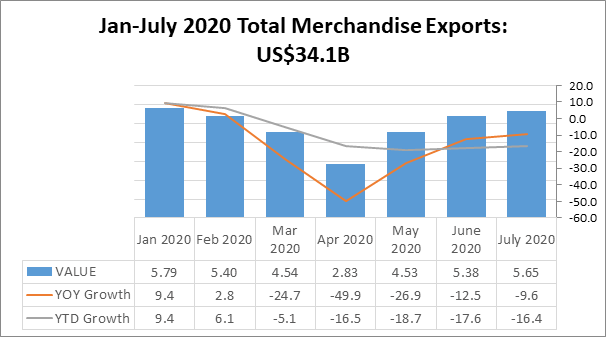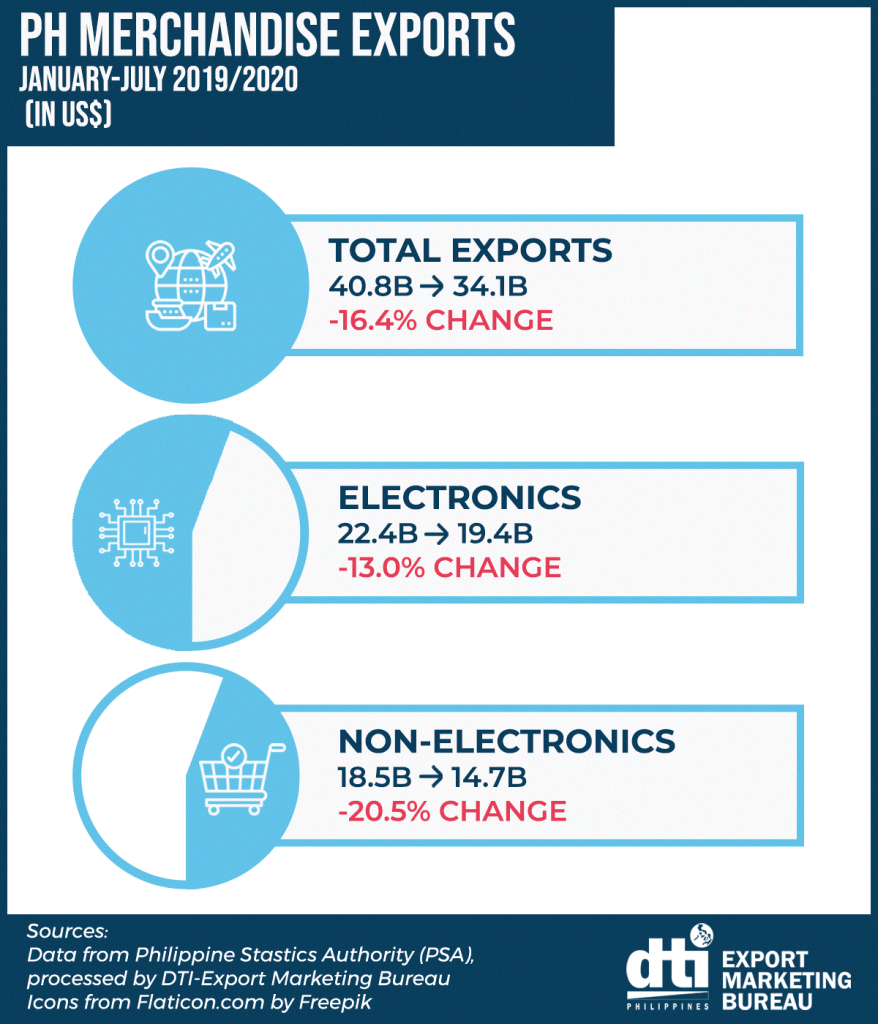 In terms of value, merchandise exports only reached US$34.1B for the first seven months of 2020 compared to the US$40.8B posted during the same period last year. Consistent with its historical performance, Electronics accounted for over half of the country’s total merchandise exports (57%) in the review period, while Non-electronics made up the remaining 43%.