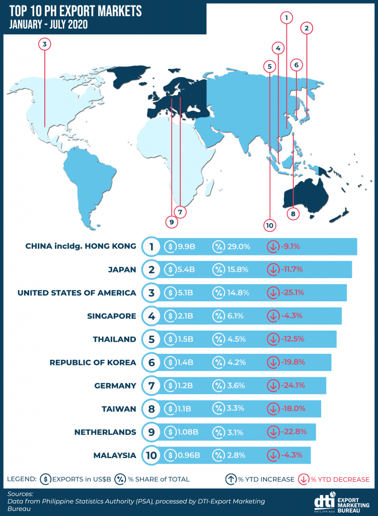 In terms of market share, the top 10 PH export destinations in the review period absorbed over 87% of the country’s merchandise goods.