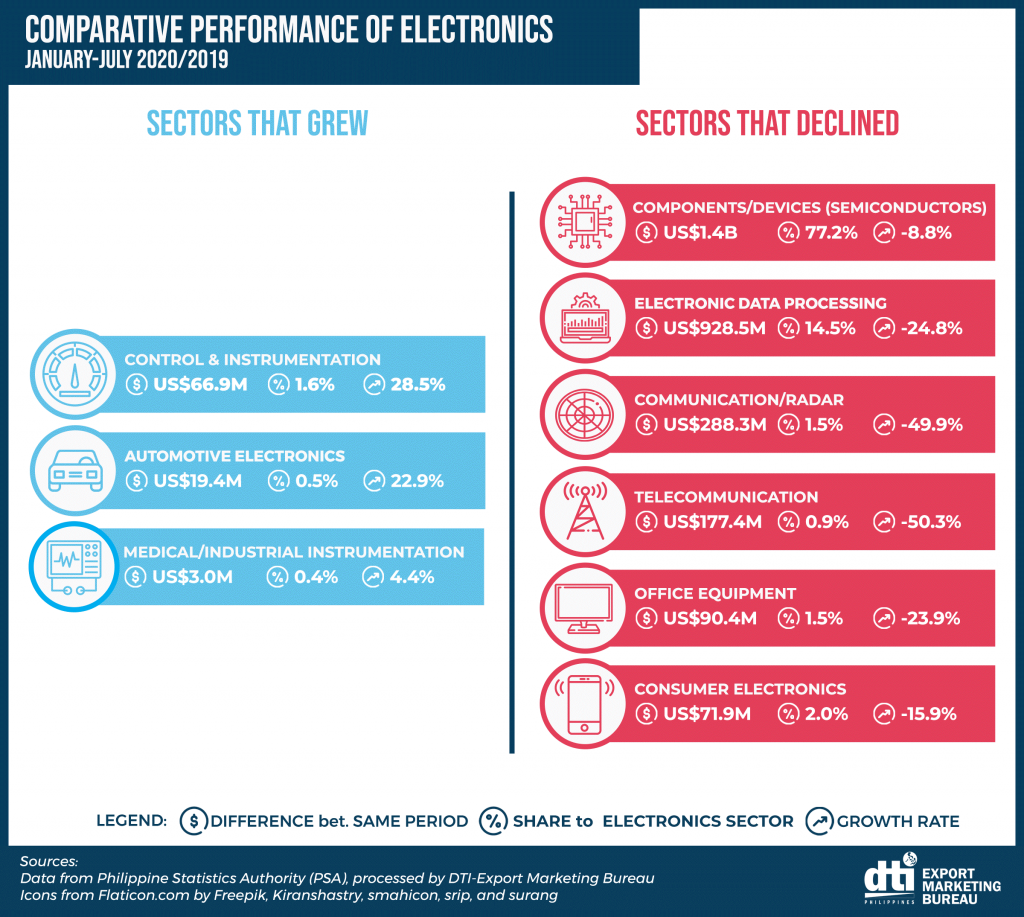 Semiconductors still get the lion share of Electronics exports at 77.2% and 44.0% of total PH merchandise exports. However, its total exports went down by 8.8% to USD15.0B in Jan-July 2020 from USD16.4B in the same period in 2019.