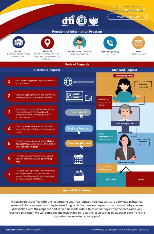 The purpose of the Department of Trade and Industry’s (DTI) Freedom of Information (FOI) Manual is to guide the public in requesting for information from the Department of Trade and Industry (DTI) as prescribed under Executive Order (EO) No. 2 (s. 2016).