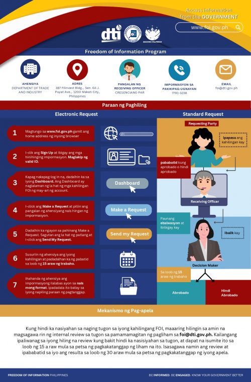 - Bring the filled-out FOI Request Form to the nearest DTI office.