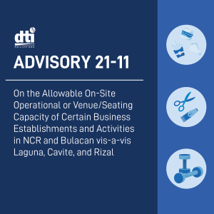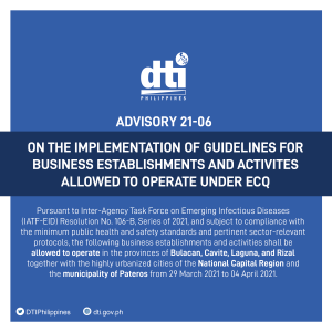 Issued by the Department of Trade and Industry (DTI) and the Department of Labor and Employment (DOLE), the guidelines aim to assist private institutions allowed to operate during Enhanced Community Quarantine (ECQ) and General Community Quarantine (GCC) in developing the minimum health protocols and standards in light of the COVID-19 pandemic.