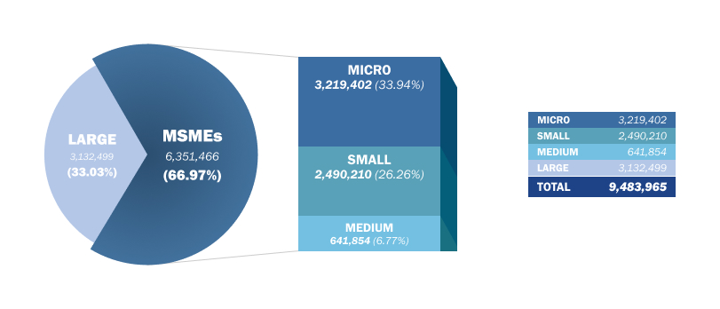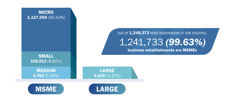 The 2023 List of Establishments (LE) of the Philippine Statistics Authority (PSA) recorded a total of 1,246,373 business enterprises operating in the country. Of these, 1,241,733 (99.63%) are MSMEs and 4,640 (0.37%) are large enterprises. Micro enterprises constitute 90.43% (1,127,058) of total establishments, followed by small enterprises at 8.82% (109,912) and medium enterprises at 0.38% (4,763).