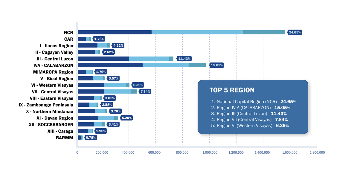In terms of regional distribution, the majority of jobs are generated by MSMEs in the National Capital Region (NCR) with 1,565,495 jobs; followed by MSMEs in Region 4-A (CALABARZON) with 955,843; Region 3 (Central Luzon) with 726,288; Region 7 (Central Visayas), 497,774; and Region 6 (Western Visayas), 405,683.Data Source: Philippine Statistics Authority (PSA)