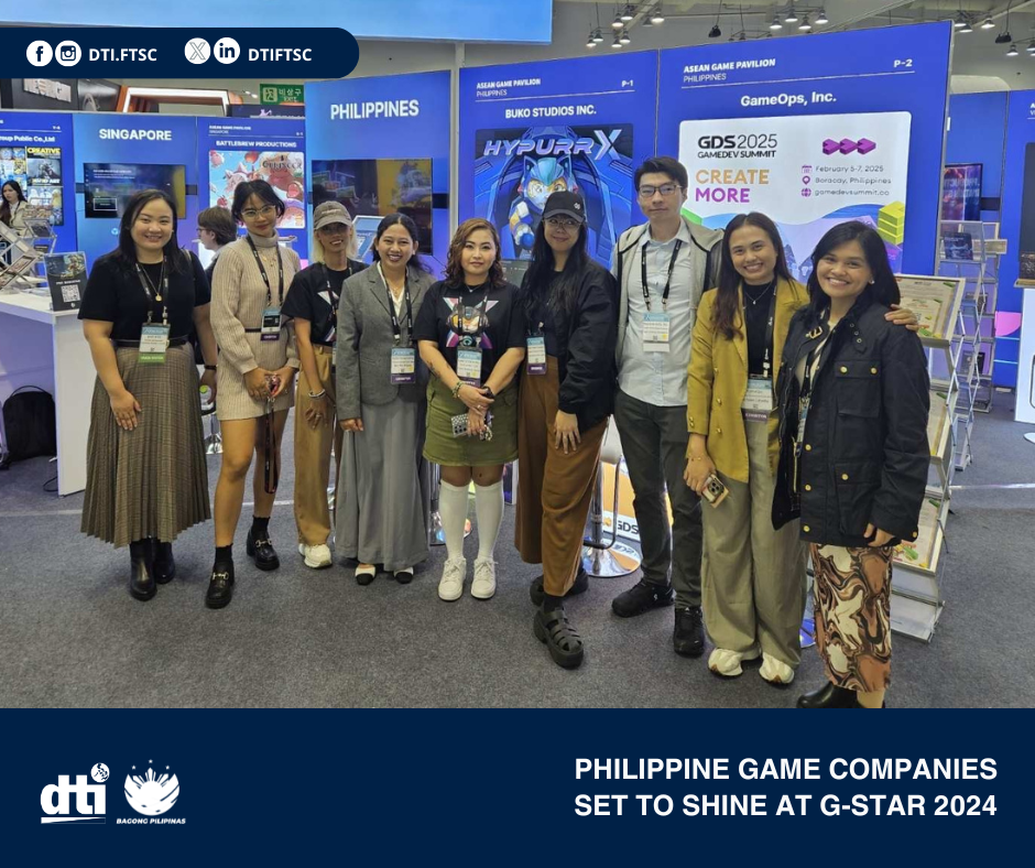 The Department of Trade and Industry (DTI), through the Export Marketing Bureau (EMB) and the Philippine Trade and Investment Center (PTIC) in Seoul, leads the Philippine participation to G-STAR 2024, the largest game exhibition in Korea. G-STAR is slated from November 14 to 16 at the Busan Exhibition and Convention Center.