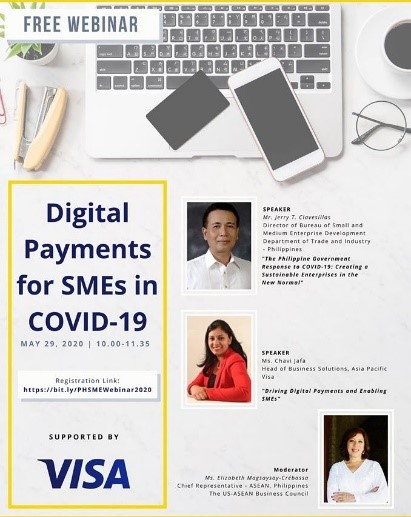 To help MSMEs understand the effects of COVID-19 on business and identify opportunities to transform online business using digital payments the US-ASEAN Business Council, Department and Trade and Industry, and DTI.Philippine Trade Training Center – Global MSME Academy proudly brings you a free webinar on “Digital Payments for SMEs in COVID-19” The last day for registration is on 27 May so register now at https://bit.ly/PHSMEWebinar2020 |