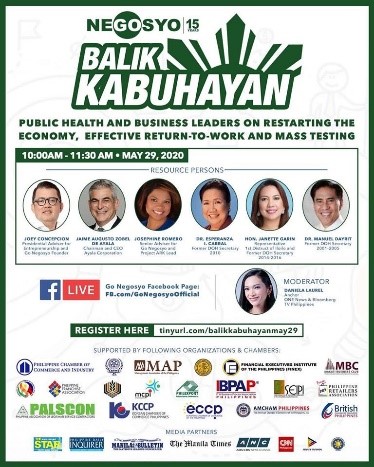 Public health and strategies of different business leaders on restarting the economy, effective return-to-work at mass testing naman ang ating pag-uusapan kasama sina Presidential Adviser for Entrepreneurship, Go Negosyo Founder Joey Concepcion; Chairman and CEO, Ayala Corporation Jaime Augusto Zobel de Ayala; Senior Adviser for Go Negosyo and Project ARK Lead Josephine Romero; Former Health Secretary Dr. Manuel Dayrit; Former Health Secretary Dr. Esperanza I. Cabral; and Former Health Secretary and Iloilo Representative Hon. Janette Garin. Please register here; https://www.tinyurl.com/balikkabuhayanmay29 |