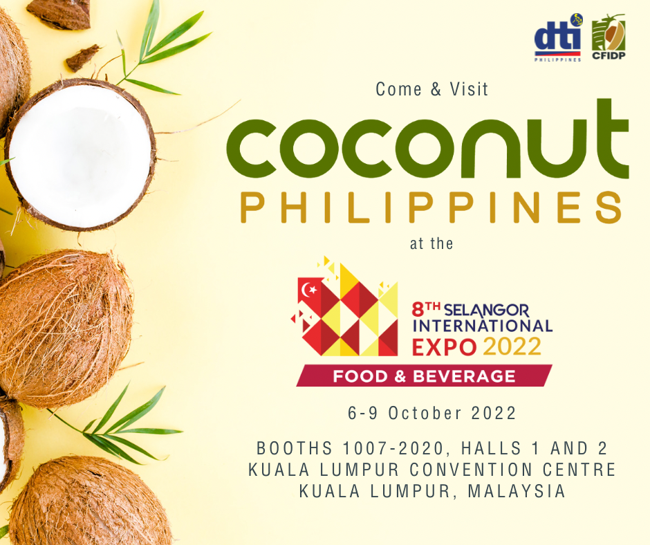 The Department of Trade and Industry (DTI), through the Export Marketing Bureau (EMB) and Philippine Trade and Investment Center (PTIC) – Kuala Lumpur will lead 16 manufacturers of coconut, coffee, and cacao products to the 8th Selangor International Expo – F&B on 6-9 October 2022 in Kuala Lumpur, Malaysia.