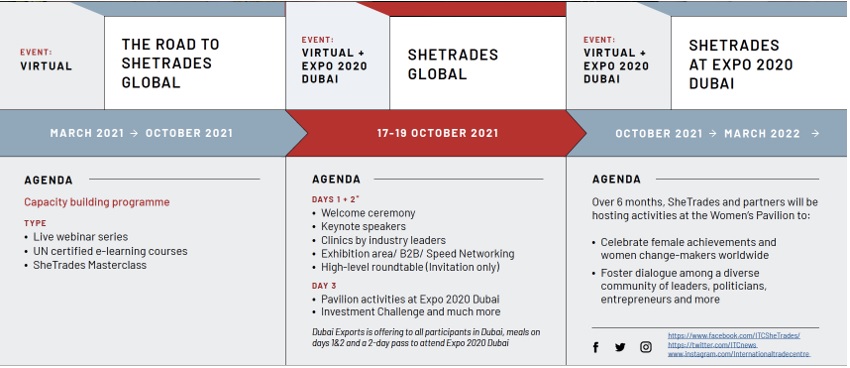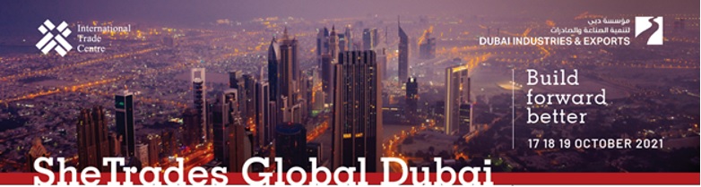 SheTrades Global Dubai is the premier global business event to connect women entrepreneurs with buyers, investors, and partners. The hybrid event will be held on 17 – 19 October 2021 during Expo 2020 Dubai. This is the 8th edition of SheTrades Global, co-hosted by ITC and Dubai Industries & Exports, in partnership with Expo 2020.