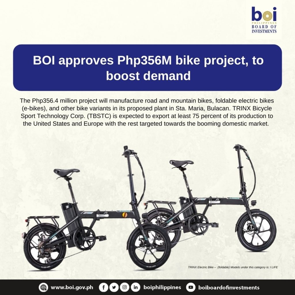 The P356.4M project will manufacture road and mountain bikes, foldable electric bikes (e-bikes), and other bike variants in its proposed plant in Sta. Maria, Bulacan. TBSTC is expected to export at least 75% of its production to the United States and Europe with the rest targeted towards the booming domestic market.