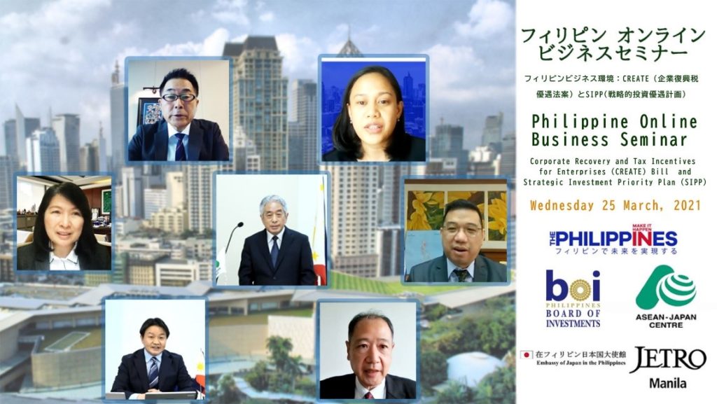 The ASEAN-Japan Centre (AJC) together with the Department of Trade and Industry’s Board of Investments (DTI-BOI) conducted a webinar (25 March 2021) on the Corporate Recovery and Tax Incentives for Enterprises (CREATE) Act and Strategic Investment Priority Plan (SIPP) as part of AJC’s ASEAN Update series and DTI-BOI’s roll-out of CREATE Campaign. The event was co-organized with the Embassy of Japan in the Philippines and Japan External Trade Organization in Manila (JETRO Manila) and supported by the Japan Chamber of Commerce and Industry (JCCI), Japan-Philippines Economic Cooperation Committee (JPECC), and Philippine Trade and Investment Centers in Tokyo and Osaka.
