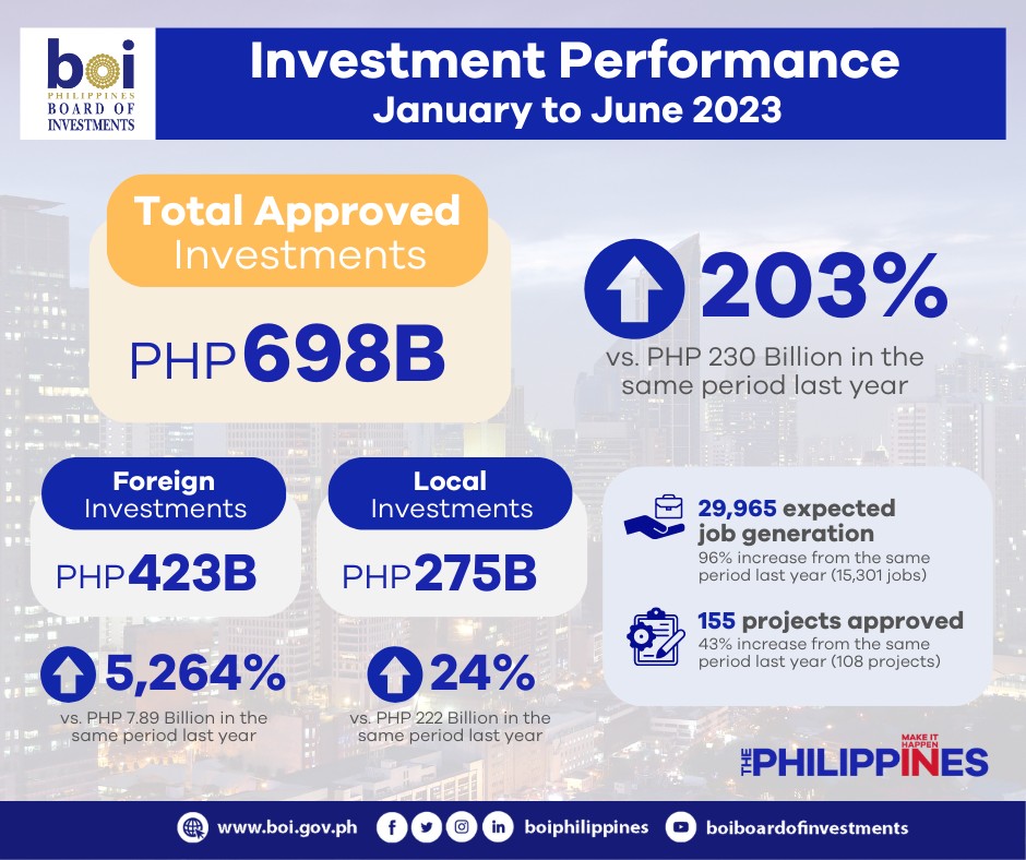 MAKATI CITY — The Philippine Board of Investments (BOI) is moving closer to hitting its investments target for 2023 as it approves P698 Billion worth of investments composed of 155 projects for the first half of 2023. This is a 203 percent-growth from last year’s P230 Billion for the same period.