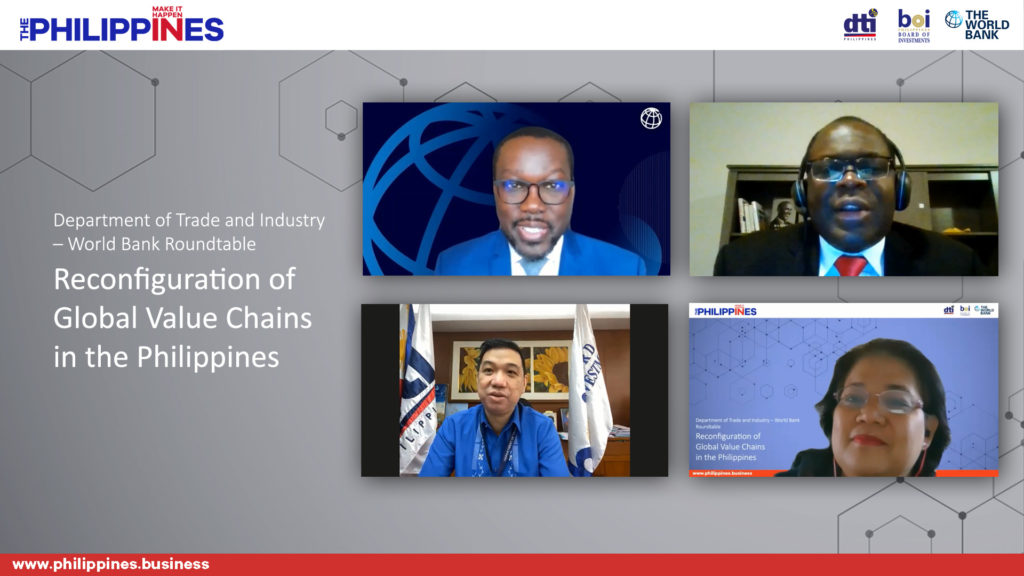 The roundtable was organized by the DTI-BOI and the World Bank to discuss how GVCs can rethink, diversify and redeploy their strategies to better adapt with the changing times. Public and private stakeholders attended the session. Among government agencies and representatives in attendance were the National Economic Development Authority, Bureau of Import Services, Foreign Trade Service Corps, Mindanao Development Authority, Subic Bay Metropolitan Authority and Philippine Retirement Authority. Private groups included the Pharma and Healthcare Association of the Philippines, Philippine Pharma Manufacturers.