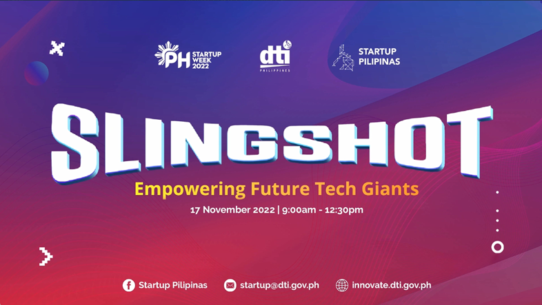 The Department of Trade and Industry (DTI) will once again hold the Slingshot Conference with the theme “Empowering Future Tech Giants” on 17 November 2022 as one of the major events during the Philippine Startup Week 2022 (PHSW22).