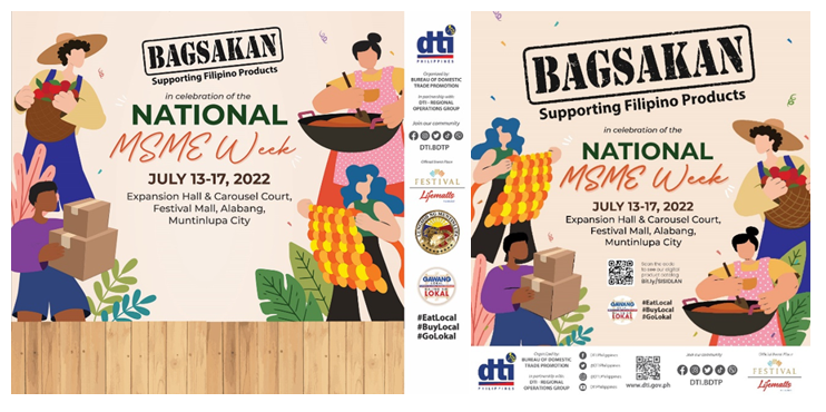 The Department of Trade and Industry – Bureau of Domestic Trade Promotion (DTI-BDTP) is celebrating the National MSME Week with a special Bagsakan at the Expansion Hall and Carousel Court of Festival Mall in Muntinlupa City from 13 – 17 July 2022, from 10:00 a.m. to 9:00 p.m. Admission is free of charge.