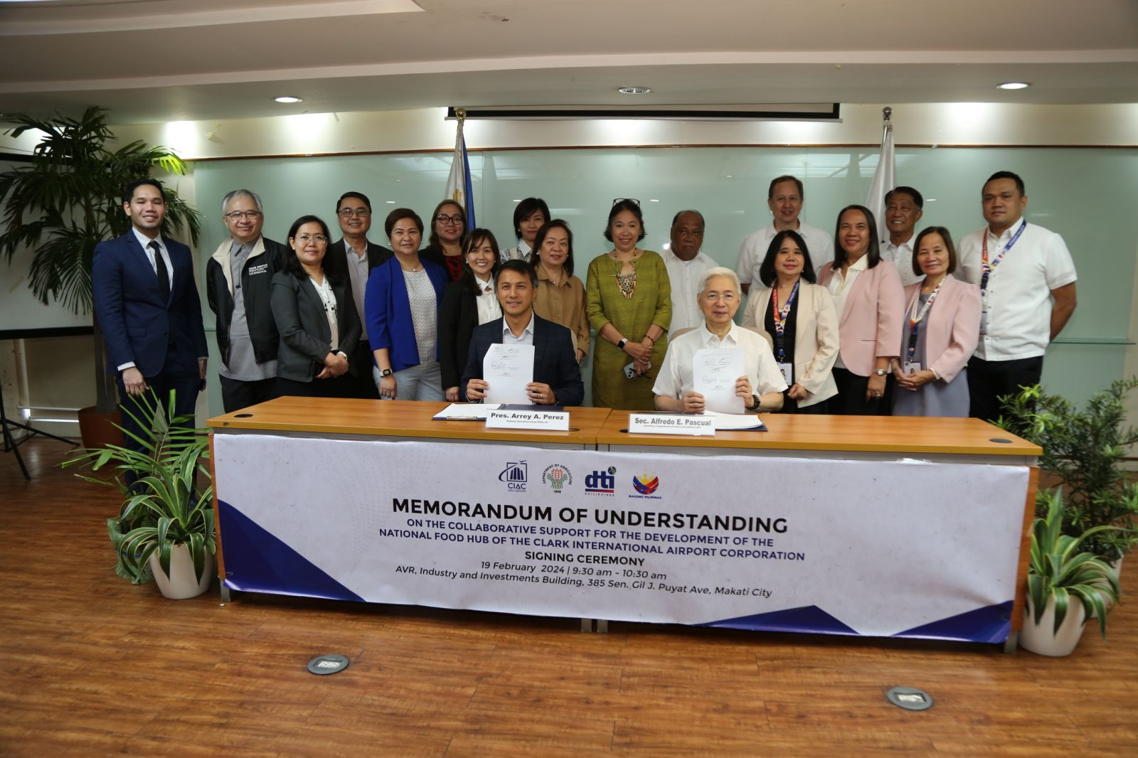 MAKATI CITY–The Department of Trade and Industry (DTI) together with the Department of Agriculture (DA) signed a Memorandum of Understanding (MOU) with the Clark International Airport Corporation (CIAC) to collaborate in the development of a mega food hub in Clark City, on 19 February 2024.