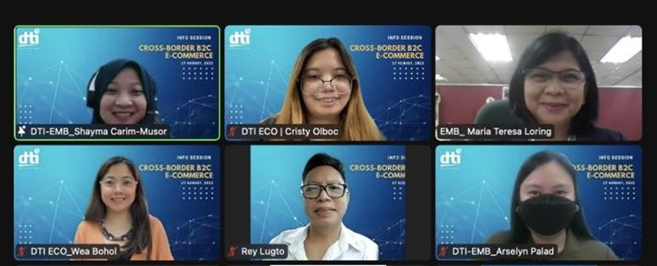 The Department of Trade and Industry (DTI), through the Export Marketing Bureau (EMB) and in partnership with the E-Commerce Office (ECO), conducted an online information session on Cross-Border B2C E-Commerce on 17 August 2022. The webinar was attended by more than 100 participants from both the public and private sectors.