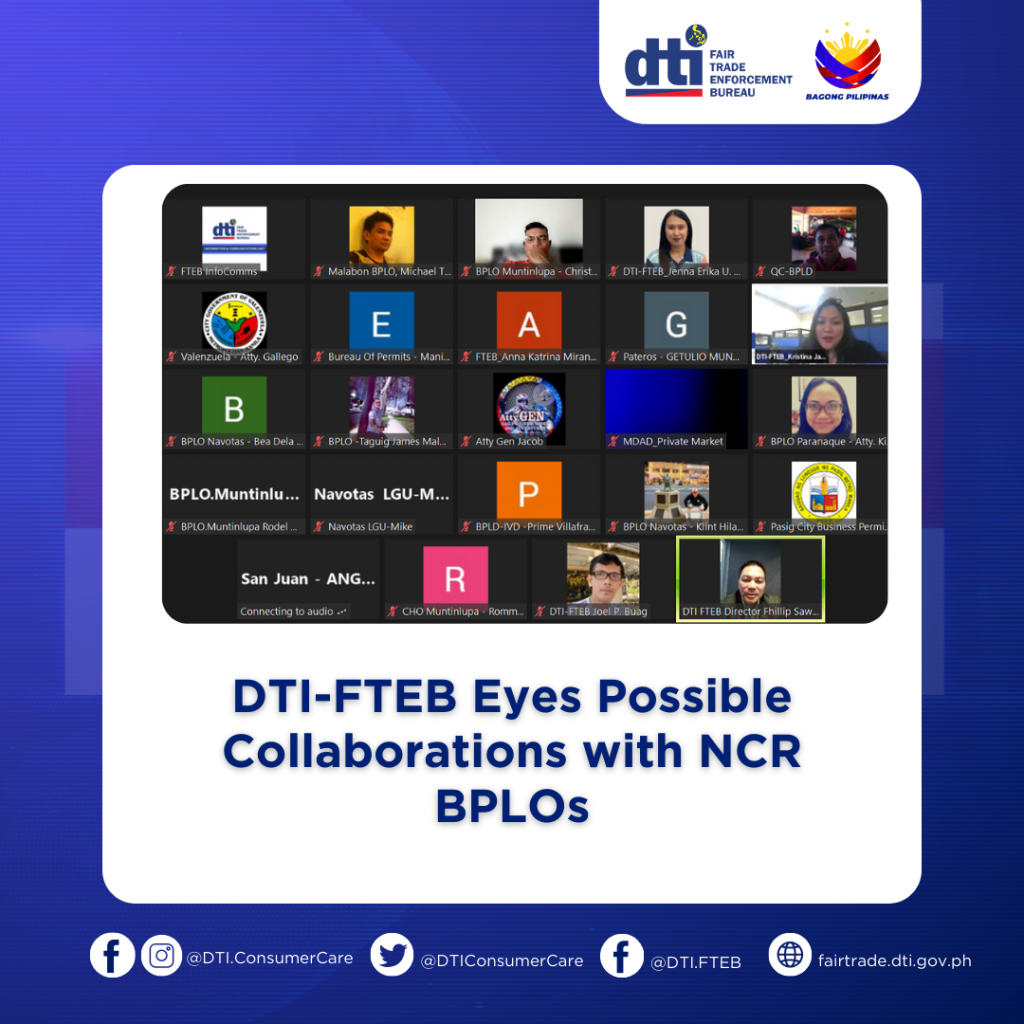 The online meeting with the BPLO Officers was attended by Local Government Units (LGUs) from the NCR including Malabon City, Muntinlupa City, Valenzuela City, Manila City, Pateros City, Navotas City, Quezon City, and San Juan City. The FTEB Senior Trade-Industry Development Specialist, Ms. Kristina D. Javier, spearheaded the discussion on the role of DTI-FTEB in protecting consumers and their welfare, being the DTI’s primary regulatory arm, particularly for enforcement.