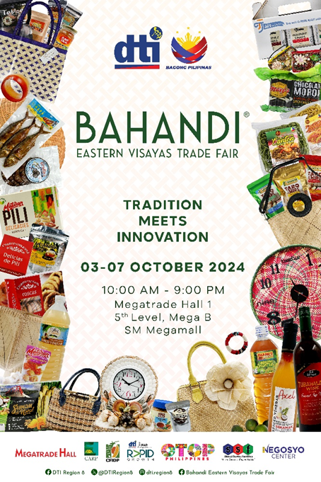 The Department of Trade and Industry (DTI) Region 8 will hold the 24th Bahandi Eastern Visayas Trade Fair on 3 to 7 October 2024 at the Mega Trade Hall 1, 5th level, Mega B, SM Megamall, Mandaluyong City to showcase Eastern Visayas’ artisanal products.