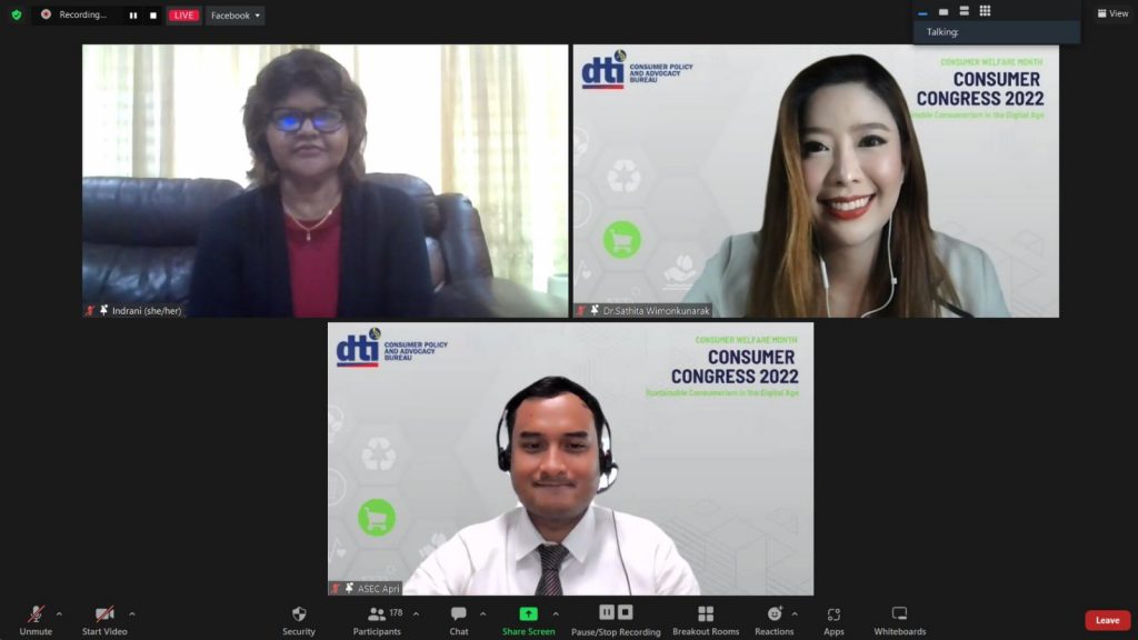 Mr. Putu “Apri” Swajaya emphasized the importance of stronger collaboration among ASEAN Member States, as well as the need for governments to strengthen relationships with Consumer Associations. Dr. Sathita Wimonkunarak Dr. Sathita discussed the role of consumer associations in empowering Thai consumers, emphasizing the significance of consumer programs and activities such as product testing. Lastly, Ms. Indrani Thuraisingham urged action to address climate change and the reality of its negative consequences in our daily lives. She stated that the Federation of Malaysian Consumer Associations has collaborated with a Malaysian electrical utility provider on digitalizing energy via smart meters. Malaysians can now monitor their power consumption in real-time every 30 minutes.