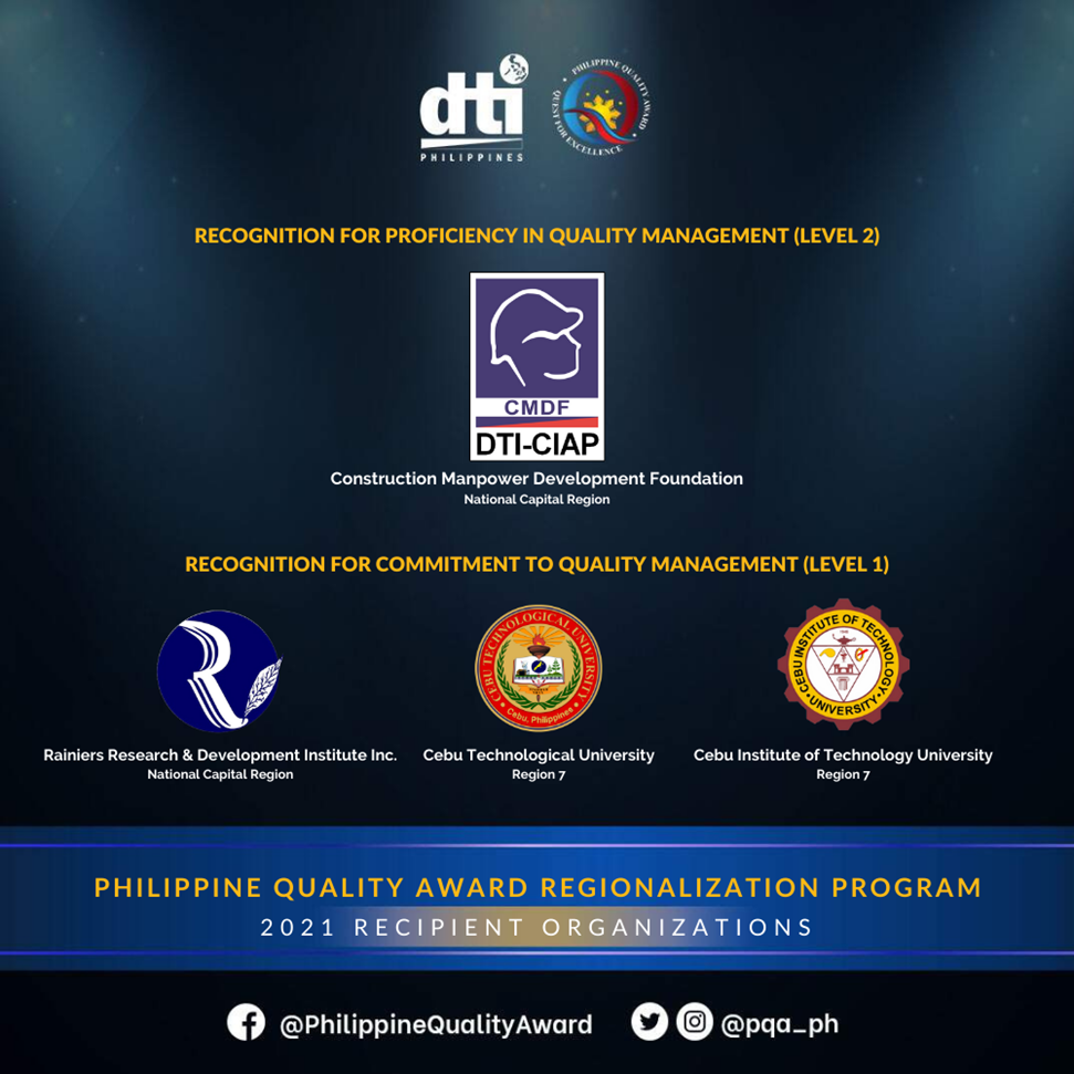 As part of the PQA 24th Conferment Ceremony, DTI Secretary Ramon M. Lopez honored recipients of the PQA Regionalization Program Pilot Run which includes Rainiers Research and Development Institute (NCR), Cebu Institute of Technology-University (Region 7), and Cebu Technological University (Region 7) for Level 1 or Recognition for Commitment to Quality Management; and, Construction Manpower Development Foundation (NCR) for Level 2 or Recognition for Proficiency in Quality Management.