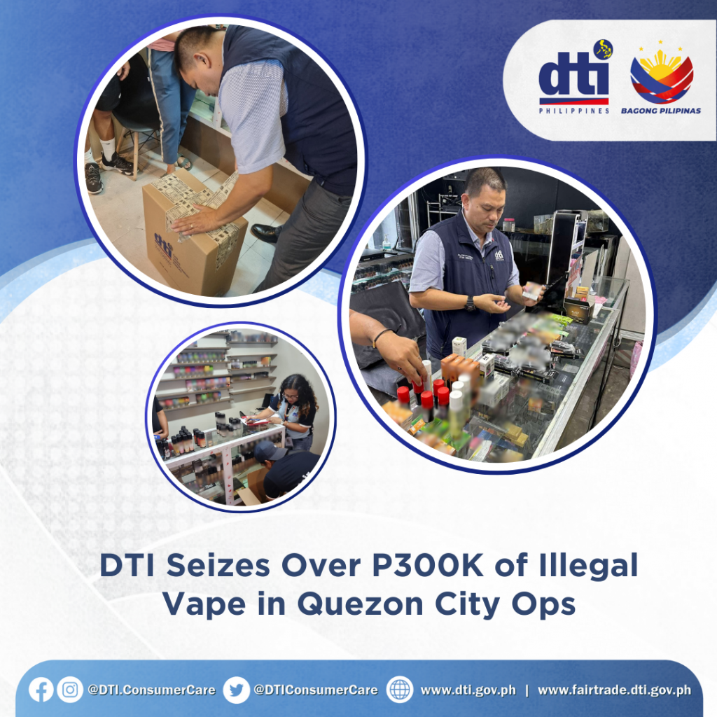 The Department of Trade and Industry (DTI) through the Fair-Trade Enforcement Bureau (FTEB) seized Vape Units worth PhP302,300.00 through focused enforcement operations in Quezon City on March 14, 2024.