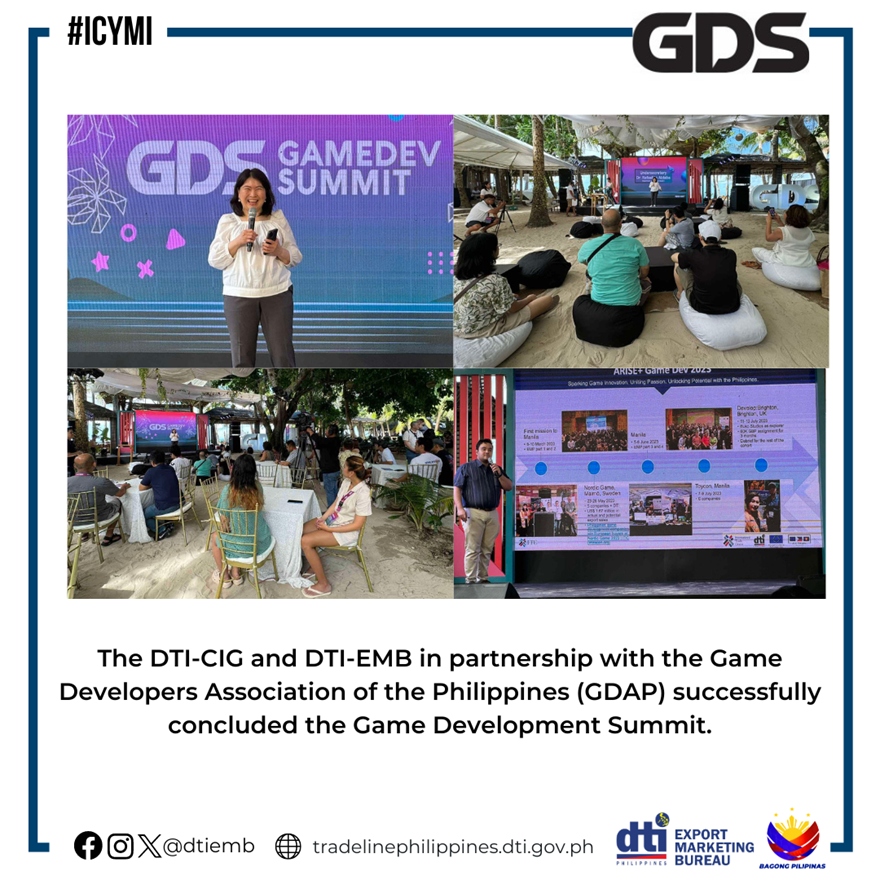 The Department of Trade and Industry (DTI), through the Competitiveness and Innovation Group (CIG) and the Export Marketing Bureau (EMB), in partnership with GameOps, Inc. and the Game Developers Association of the Philippines (GDAP), has successfully concluded the Game Development Summit (GDS) in Boracay on 15-16 February 2024. This is the first International Game Industry Summit in the Philippines featuring two (2) tracks: External Development and Indie Games.