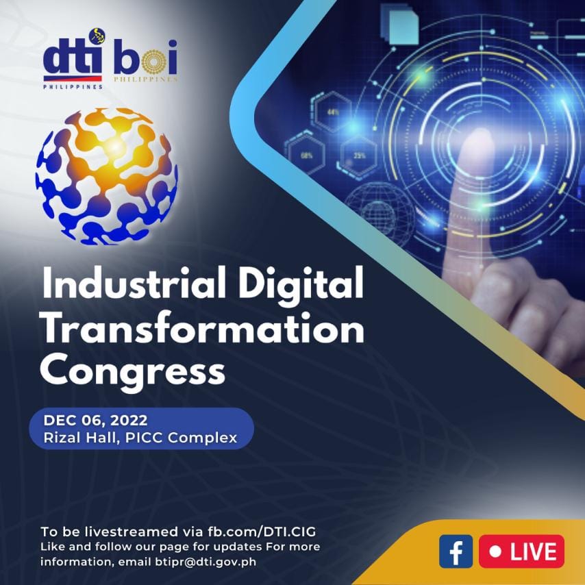Makati City- The Department of Trade and Industry-Competitiveness and Innovation Group (DTI-CIG), in collaboration with the Board of Investments (BOI), will hold the first-ever Industrial Digital Transformation Congress (IDTC) on 06 December 2022, with the theme “Digital Transformation and Strategic Repositioning for Globally Competitive and Innovative Industries.”