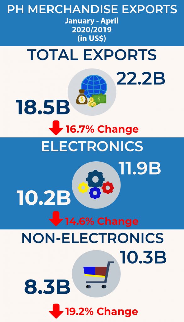 Electronics made up more than half of the country’s merchandise exports (55.5%) in the review period, while the remaining 45% was comprised of non- electronics. Electronics exports plunged by 14.6% in the first four months of the year to USD10.2B from USD11.9B posted in the same period in 2019. Meanwhile, non-electronics declined by 19.2% to USD8.3B YTD from USD10.3B in the same period last year.