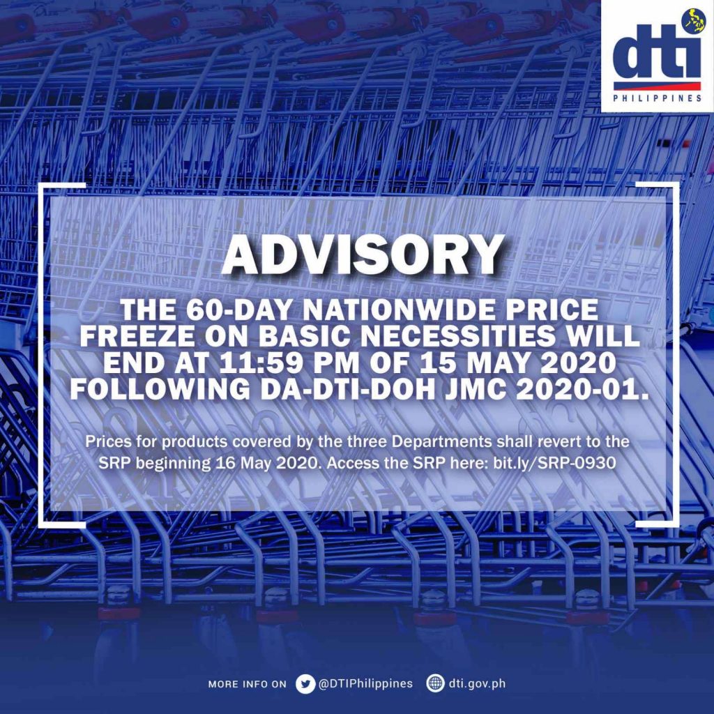 The 60-day nationwide price freeze on all basic necessities ended at 11:59 PM last 15 May 2020 in accordance to DTI, Department of Agriculture (DA), and Department of Health (DOH) Joint Memorandum Circular (JMC) No. 2020-01 which says that the price freeze shall only take effect for 60 days or until 15 May 2020.