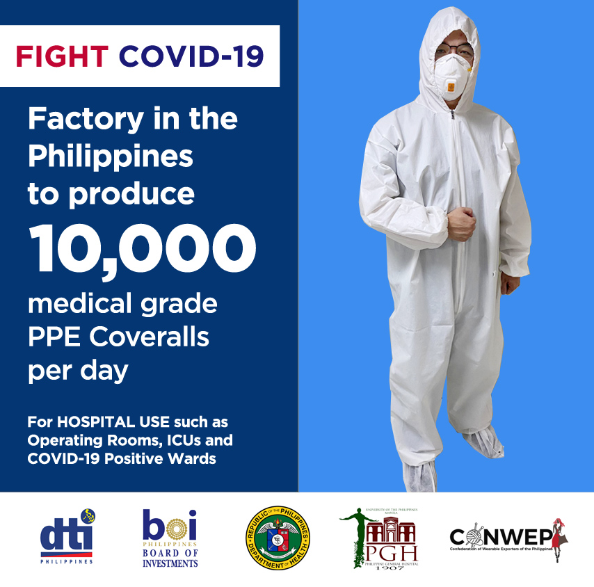 Heeding the government’s call to address the deficient supply of Personal Protective Equipment (PPE) in the country, member-companies of the Confederation of Wearable Exporters of the Philippines (CONWEP) will start the local production of medical-grade PPE coveralls for healthcare workers.