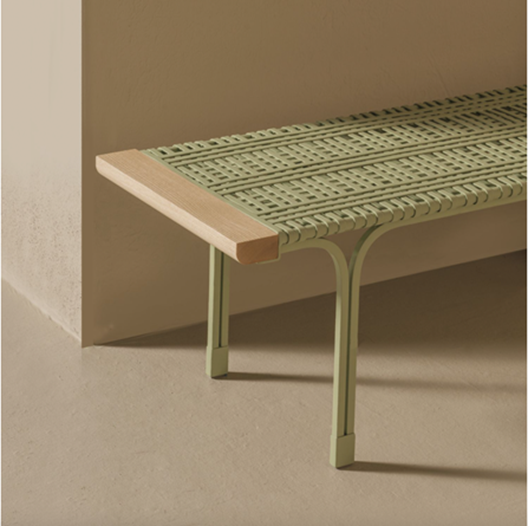 In the hands of designer Jim Zarate-Torres and the artisans he works with, metal diverges from its top-of-mind form of unfeeling grey, instead transforming into light, delicate, and, in the case of the Cheque bench, orange and mint powder-coated steel.