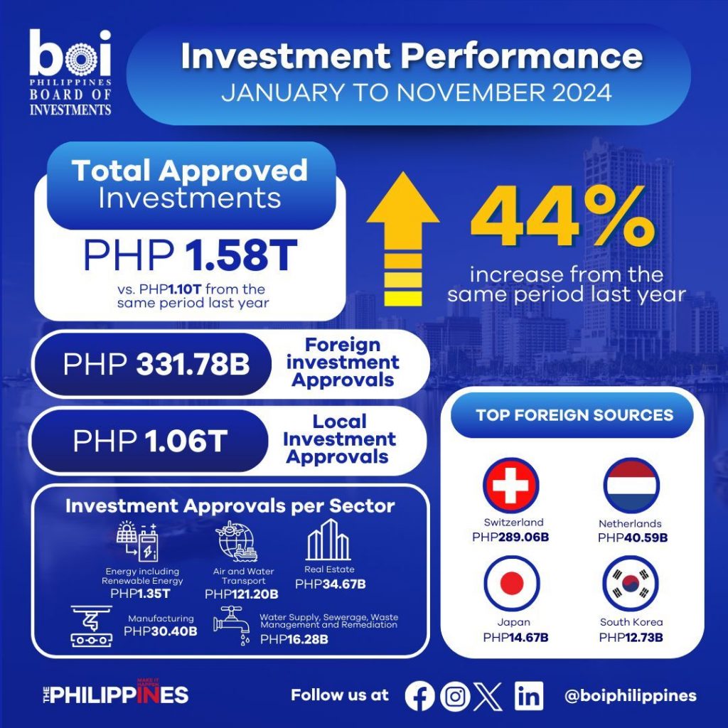 Investment approvals soar to PHP 1.58T as of November 2024, up by 44% from last year