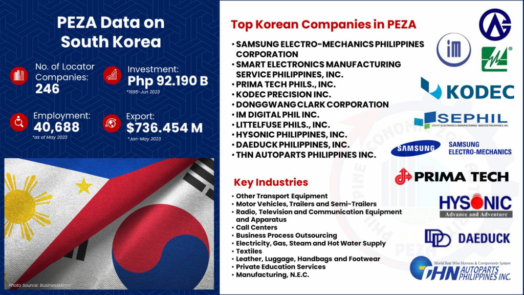As of June 2023, PEZA has a total of 246 registered projects from South Korea which generate P92.190 billion investments, US$ 736.454 Million exports, and 40,688 employments.
