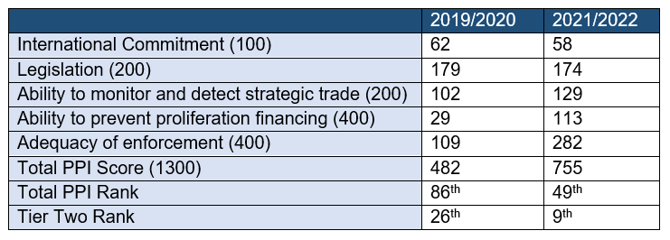 Five super criteria and 105 sub-criteria or indicators make up the PPI. These are: (1) International commitment to preventing strategic commodity trafficking; (2) legislation to regulate and oversee strategic commodity trade; (3) ability to monitor and detect strategic trade; (4) ability to prevent proliferation financing; and (5) effectiveness of enforcement against strategic commodity trafficking.