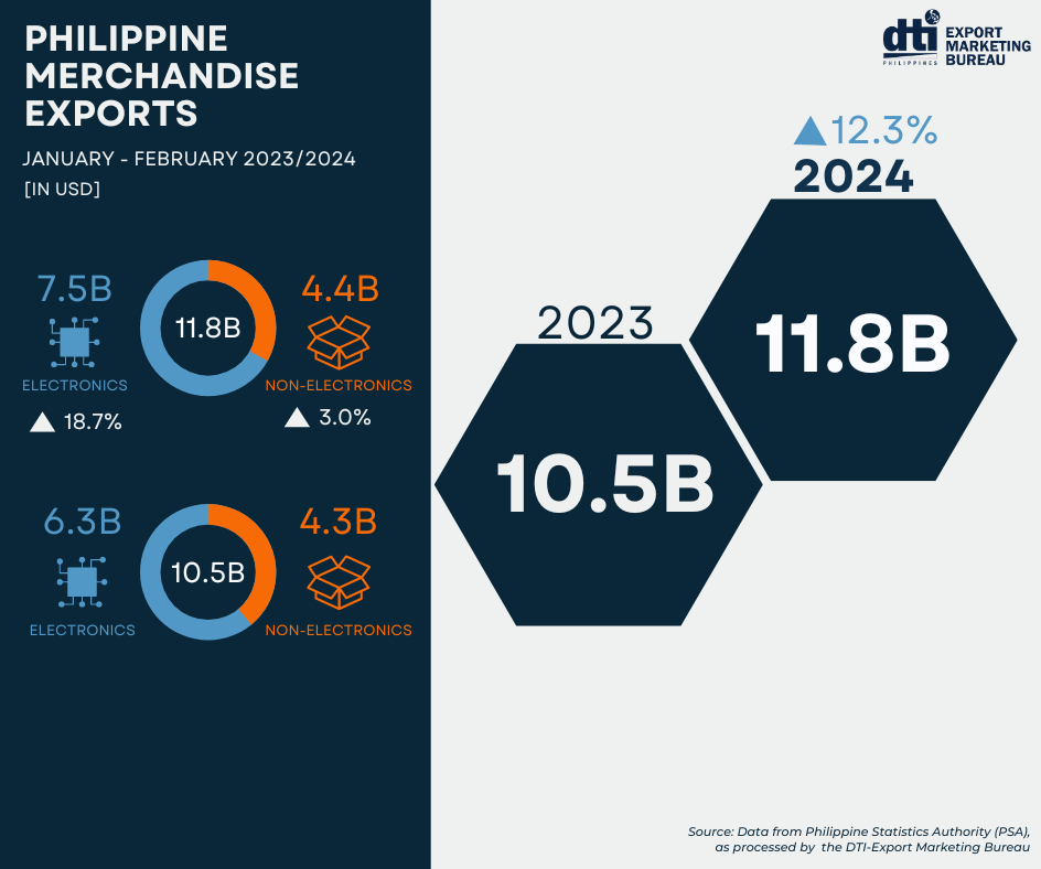 “The robust export performance in February, following the year-on-year increase of 9.1% in the previous month, marks a promising start to the year for the Philippine export sector. The electronics sector is evidently recovering, even catching up with the export figures from two years ago,” said DTI Secretary Fred Pascual.