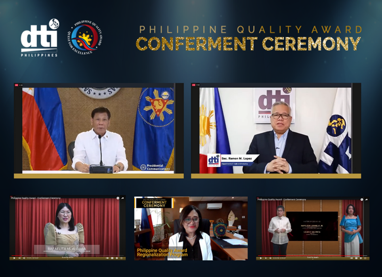 President Rodrigo Duterte conferred recognitions for quality management to fourteen (14) organizations thru the Philippine Quality Award (PQA) Program of the Department of Trade and Industry (DTI) during a pre-recorded Ceremony broadcasted via Facebook on 23 March 2022.