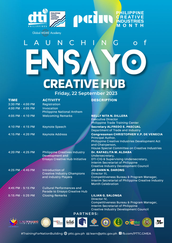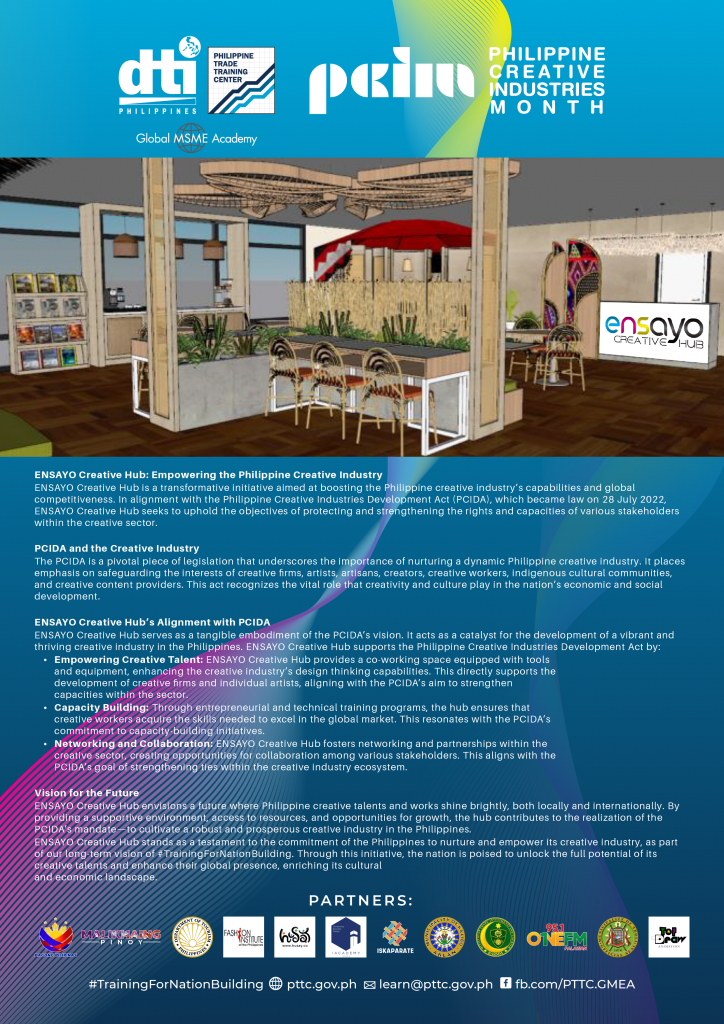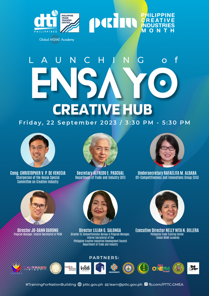 The Philippine Trade Training Center – Global MSME Academy (PTTC-GMEA) is thrilled to announce the launch of the ENSAYO Creative Hub, a project aimed at bolstering the Philippine creative industry’s capabilities and global competitiveness. The official launch event will take place on September 22, 2023, from 3:30 PM to 5:30 PM, and will be attended by esteemed guests, including Cong. Christopher V.P. De Venecia, Chairperson of the House Special Committee on Creative Industry, and Secretary Alfredo E. Pascual of the Department of Trade and Industry (DTI).