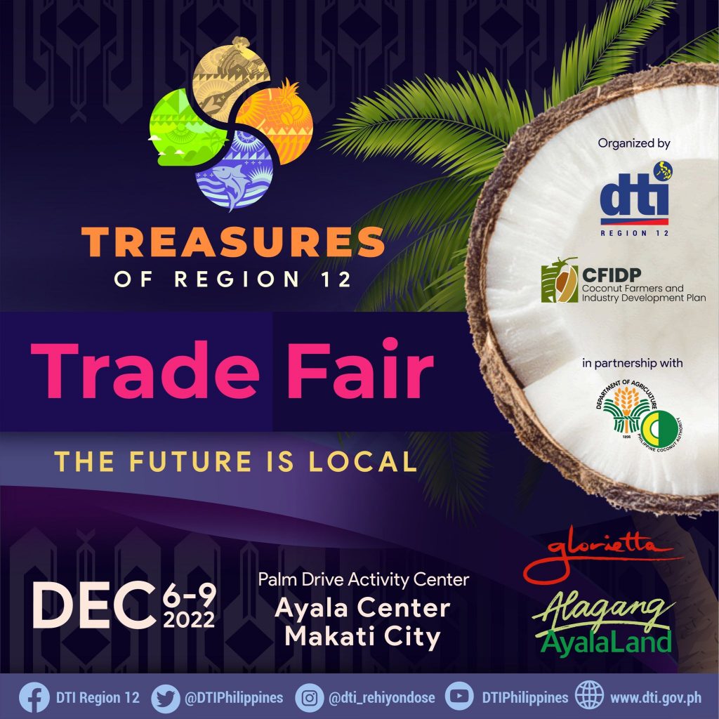 The four-day regional fair that will run from December 6 to 9, 2022 at the Palm Drive Activity Center of Glorietta Mall 2, Ayala Center, Makati banners the theme “The Future is Local” and will be participated by 25 food and 10 non-food MSMEs which are all assisted by DTI 12 under the Industry Cluster Enhancement Program – Coconut Cluster.