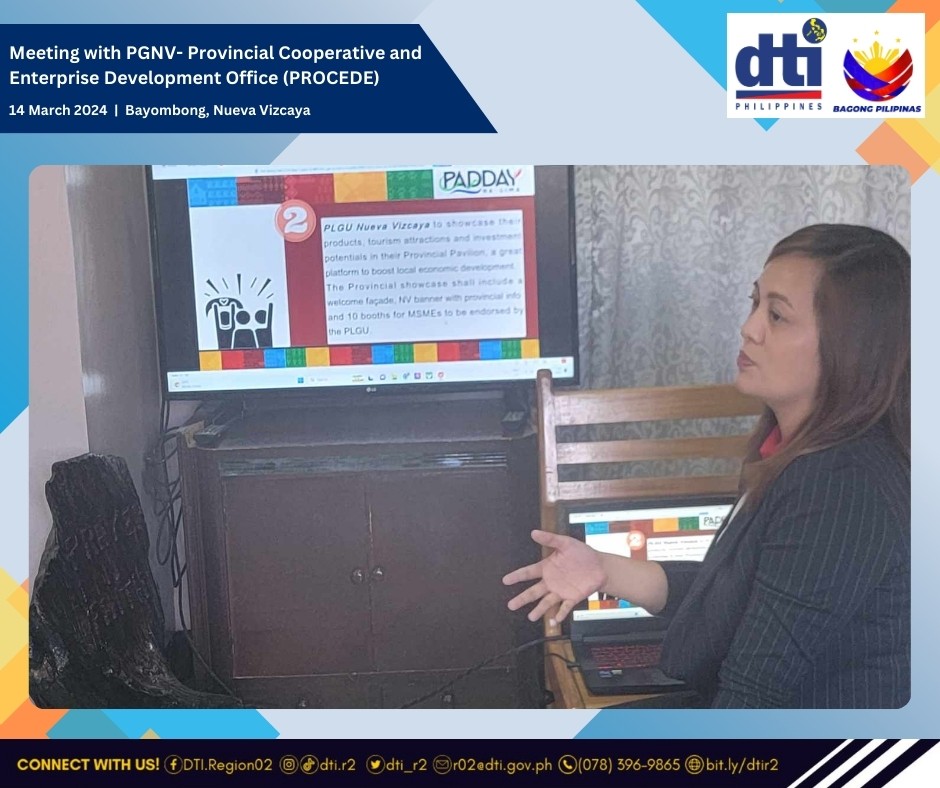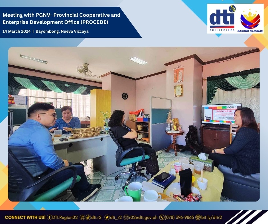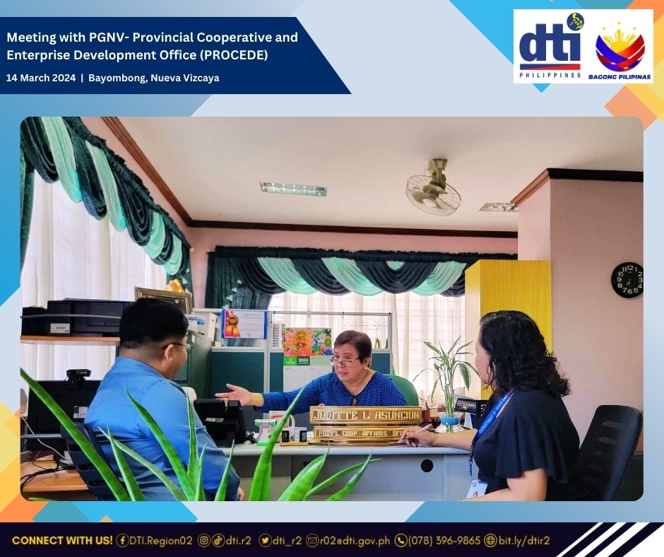 NUEVA VIZCAYA — As preparations for the upcoming DTI R2’s “Padday na Lima” Regional Trade Fair (RTF) are underway, the key officers of the Department of Trade and Industry (DTI) Region 2, through the SME Development Division led by OIC Chief Desiree Angolluan and the DTI R2 Nueva Vizcaya led by Provincial Director Atty. Michael B. Paggabao convened with PCA Officer Juditte L. Asuncion of the Provincial Government of Nueva Vizcaya (PGNV) Provincial Cooperative and Enterprise Development (PROCEDE) Office on 14 March 2024, to spark possible collaborations for the RTF happening in Alabang, Muntinlupa City, by September this year.