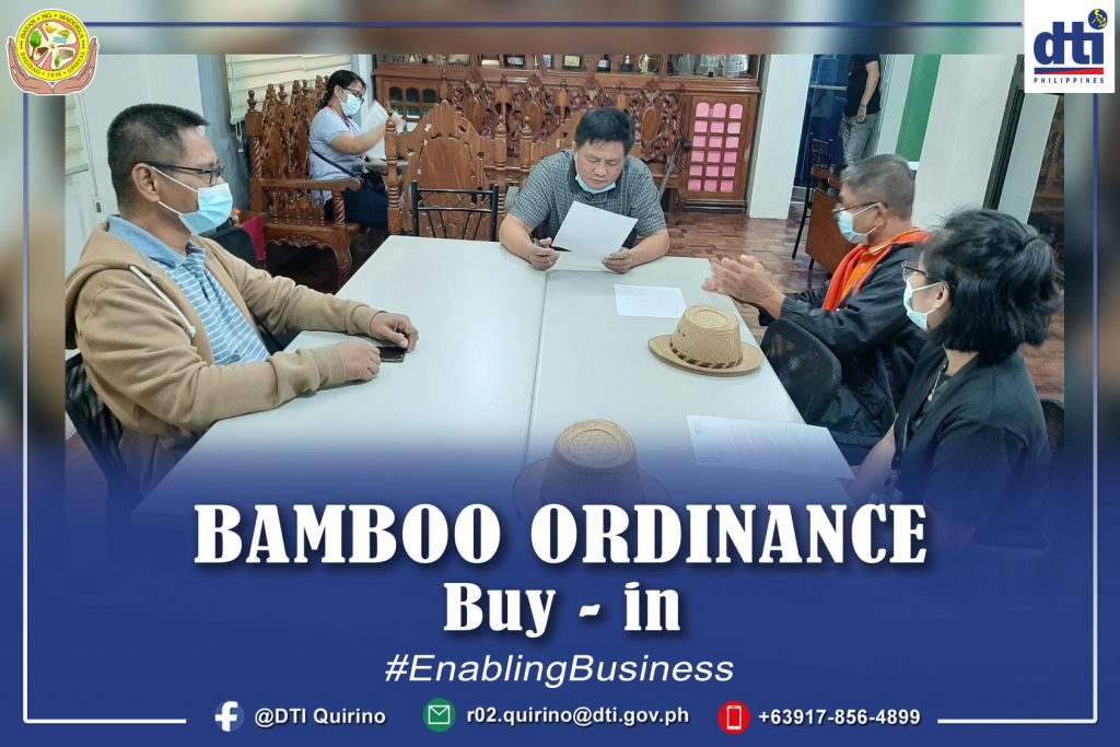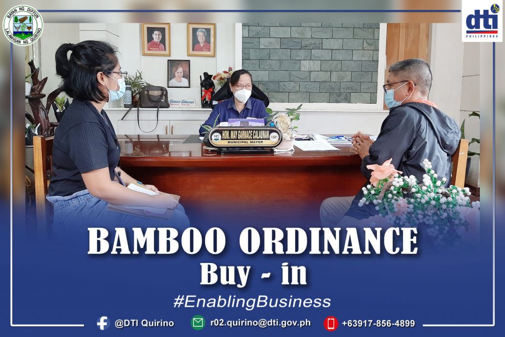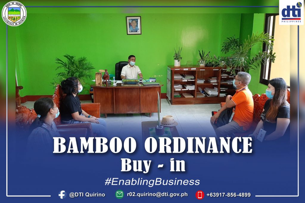 DIFFUN, QUIRINO — The Department of Trade and Industry (DTI) Region 2 Quirino Provincial Office through the initiative of PD Ma. Sofia G. Narag, conducted on 8-13 January 2021 courtesy call to the seven LGUs Local Chief Executives (LCEs) to introduce the adoption of the Provincial/Municipal Bamboo Ordinance in response to the directive of DTI-Region 2 RD Leah Pulido Ocampo to implement the Cagayan Valley Bamboo Development Project.