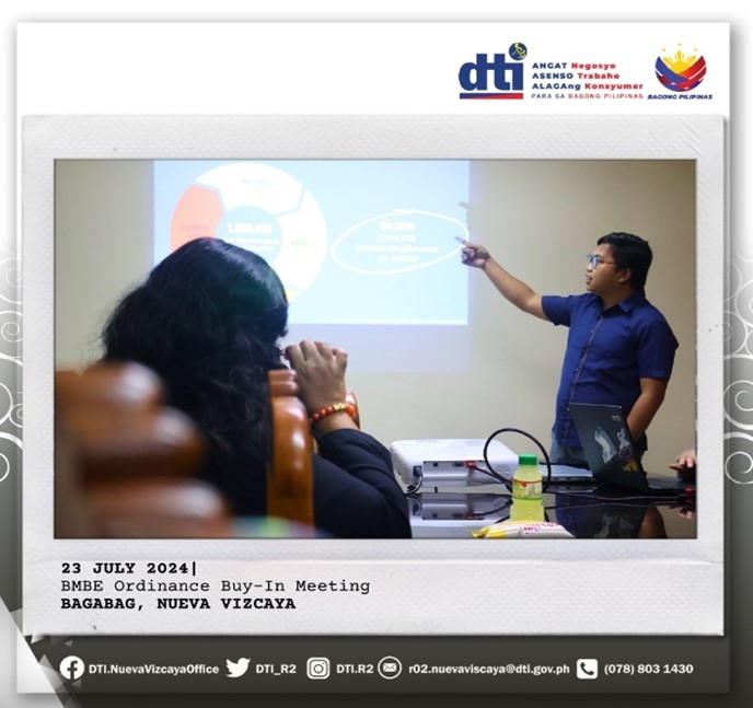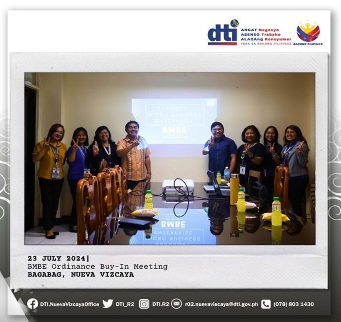The Department of Trade and Industry (DTI) Nueva Vizcaya Provincial Office led by Provincial Director Atty. Michael B. Paggabao began rolling out the campaign for more incentives for micro-enterprises in the province as the team met with Mayor Benigno Calauad of the Local Government Unit of Bagabag on 23 July 2024, to discuss the adoption of the Barangay Micro Business Enterprise (BMBE) Ordinance.